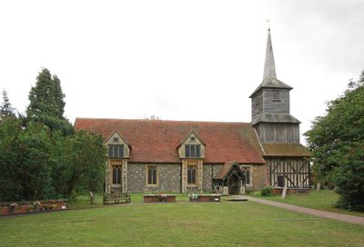 The Church of St Laurence features a three-stage timber bell tower with vertical weather boarding and a shingled broach spire atop the structure.