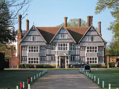 The building combines Tudor architectural elements with later additions, including an 1845 curved wing and an 1873 South-East wing built in imitation timbering.