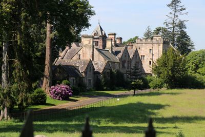The residence features squared hammer-dressed rubble walls with string courses, graduated slate roofs, and decorative stone copings topped with ball finials.