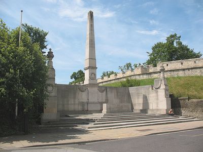The North Eastern Railway Company War Memorial is a war memorial in York featuring a 54-foot limestone obelisk at its center. A three-sided screen wall at the base displays carved swags and wreaths in relief.