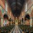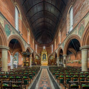 The interior contains numerous stained glass windows and architectural elements that demonstrate the evolution of religious architecture in central London.