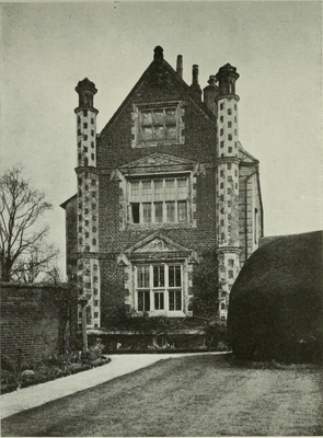 The L-shaped structure combines brick and timber-framed construction, featuring octagonal buttresses, mullioned windows, and tiled roofs across its two-story layout.
