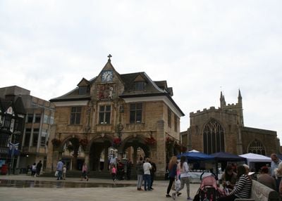 The Old Guild Hall features open round-headed arches on the ground floor and four-light mullion windows with leaded lights on the upper level.