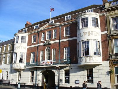 The Dolphin Hotel features Georgian architecture with prominent oriel windows and a traditional coaching entrance integrated into its structural design.