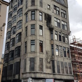 The Lion Chambers features an octagonal cupola on its corner, three irregular bays facing Hope Street, and sculpted panels between the first and second floors.