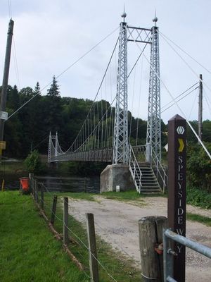 The footbridge connects the communities on both sides of River Spey, providing residents and visitors with a direct path across the water at coordinates 57.4704, -3.23168.