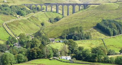 The Arten Gill railway viaduct extends 220 yards across Artengill Beck with eleven arches, each measuring 45 feet in width and reaching 117 feet above water level.