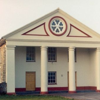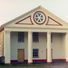 The stone building features a temple-like design with a cream-painted facade, Tuscan portico, and a round window within its pediment arrangement.