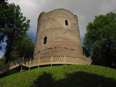 The cylindrical stone keep of Bronllys Castle reaches 24 meters high and stands on a mound overlooking the river Afon Llynfi and surrounding valleys.
