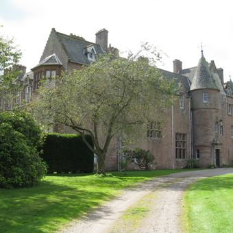 The three-story country house features towers, turrets, and incorporates an 18th-century wing with stables near the town of Kirriemuir in Angus.