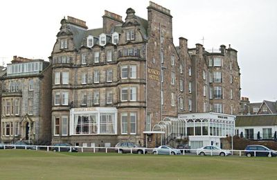 The Rusacks Hotel stands on Pilmour Links, offering views over the 1st and 18th greens of the Old Course golf course in St Andrews.