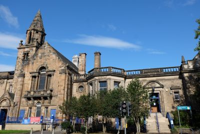The Couper Institute Library extends along Clarkston Road with its English Baroque architectural design and large reading spaces.