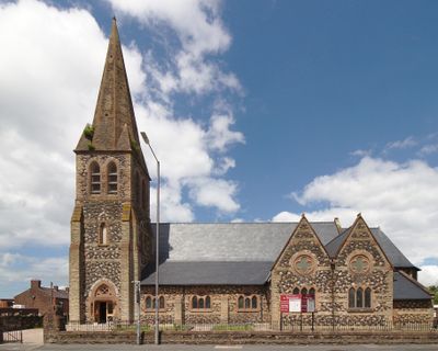 The church walls incorporate industrial copper slag material, reflecting the manufacturing heritage of the St Helens region during the Victorian period.
