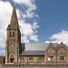 St Peter's Church features a combination of red and yellow sandstone walls, accompanied by a tower with a broach spire and distinctive lancet windows.
