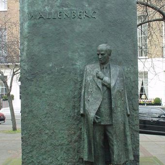 The statue represents Wallenberg's efforts to rescue Hungarian Jews during World War II by issuing protective passes under Swedish Crown authority.
