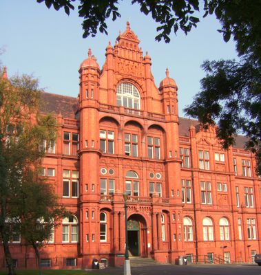 The Peel Building features red Accrington bricks and terracotta sculptures on its facade, representing late 19th-century British architectural design principles.