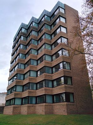 Architects Leslie Martin and Colin St John Wilson incorporated design elements influenced by Le Corbusier's concept of vertical living from the 1920s.