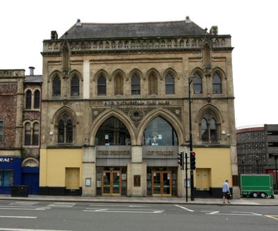The Prince of Wales stands at the corner of St Mary Street and Wood Street, featuring a Venetian Gothic design with Doric columns and neoclassical elements.
