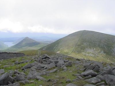 The mountain incorporates sections of the Mourne Wall, a granite structure built between 1904 and 1922 to enclose the Silent Valley Reservoir.
