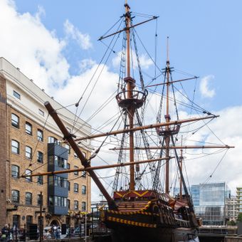 The Golden Hinde is a ship replica moored in Southwark near the Thames and recreates the structure of a 16th-century merchant vessel. The reconstruction was built using historical records and traditional shipbuilding methods to achieve authenticity in its design and layout.