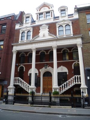 The Welsh Church of Central London is a Baptist church in the City of Westminster built from red brick with a Classical façade. The building features detailed ironwork and inscriptions that mark its architectural character.