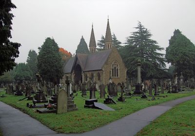 Established in 1879 following a design competition by Richmond Burial Board, the cemetery includes paired chapels constructed in 1881 by architect T Goodchild.