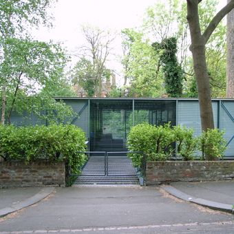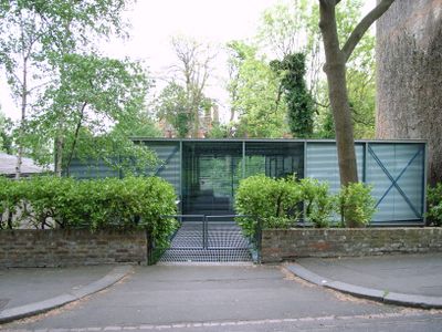 Located at 49a Downshire Hill, the house maintains strong connections between indoor and outdoor spaces through its transparent walls and garden integration.