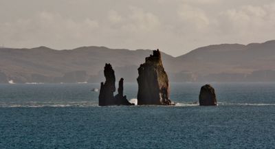 The Drongs consist of four main rock pillars standing against the Atlantic Ocean, reaching heights of approximately 60 meters above sea level.