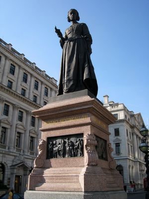 The memorial features four bronze panels showing Nightingale at Scutari Hospital, representing the advancement of medical care and nursing practices in Britain.
