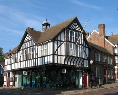 The Market House features Tudor Revival architecture with arcaded ground floor sections that face both High Street and Akeman Street.