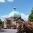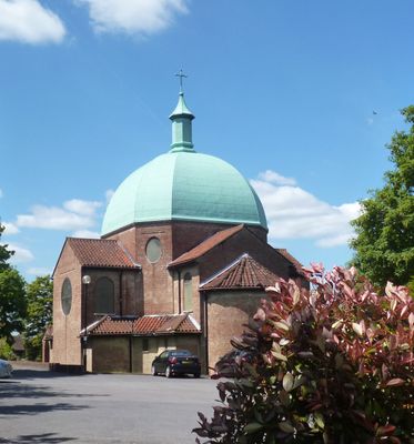 The Church of St Mary and St George features a large green copper dome and textured red brick walls in a Byzantine architectural style.