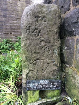 Single part of stocks 5 metres to east of Stocks Villas, Grade II listed building in Heptonstall, Calderdale, West Yorkshire, UK