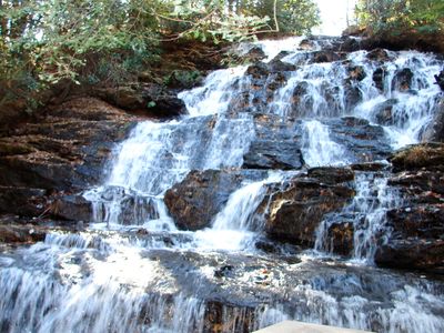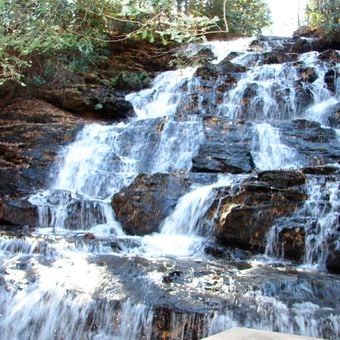 The waterfall maintains a consistent flow throughout the year as it releases water from Lake Trahlyta into Wolf Creek through engineered stone formations.