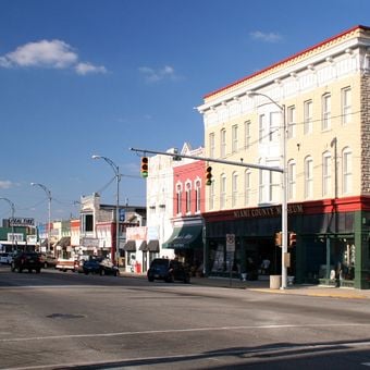 Peru is a city in Miami County, Indiana, where the Wabash River divides the community into two distinct sections along its banks. The downtown area contains blocks of local shops and historic buildings that reflect its development over time.