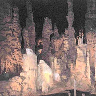 Cathedral Caverns State Park is a show cave in Marshall County, Alabama, with an enormous entrance leading to passages that wind through the underground landscape. Concrete paths allow visitors to walk through different sections and see the rock formations that have developed over thousands of years.