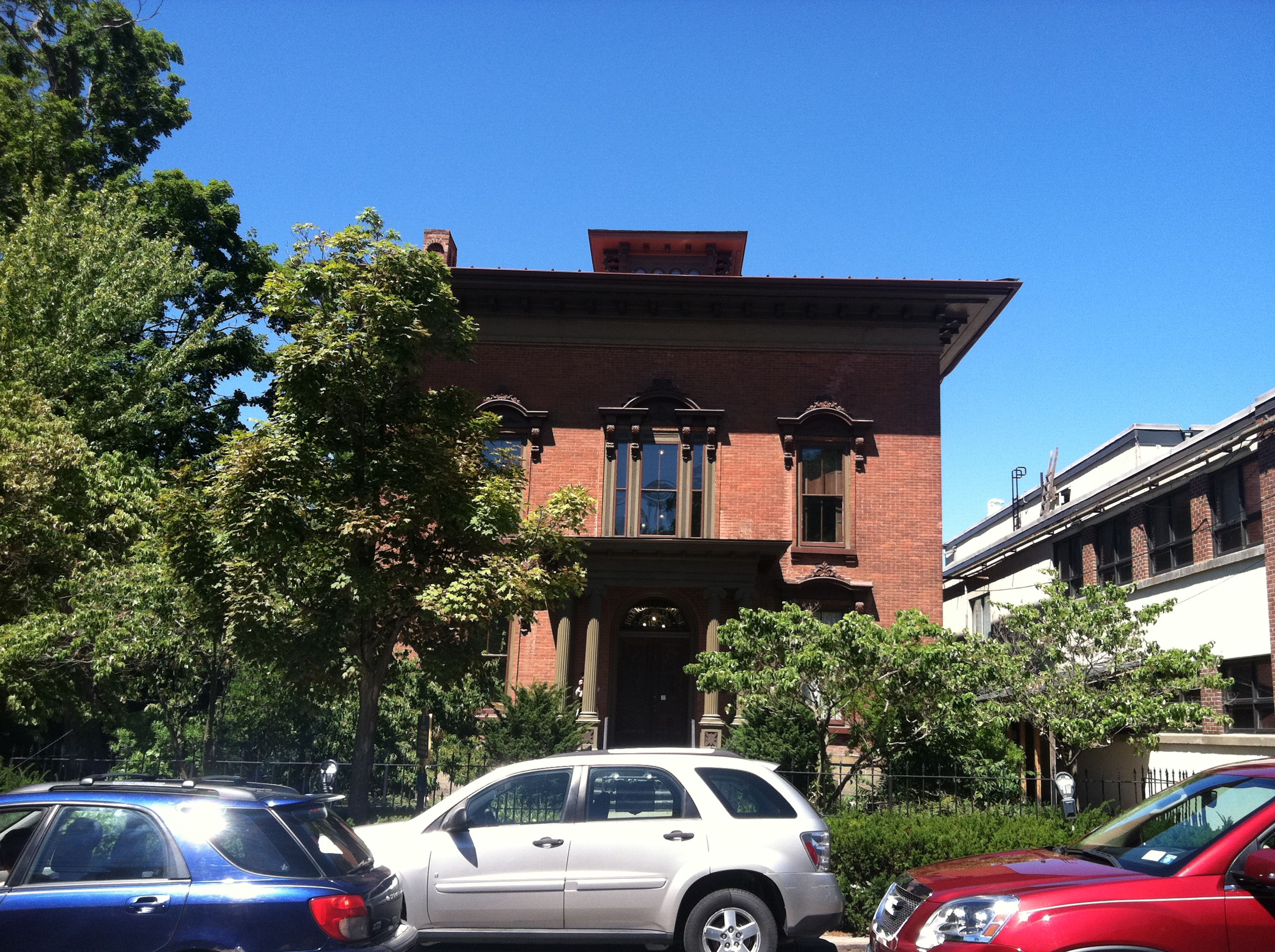 The Boardman House stands as a three-story red brick structure with brown trim, featuring a hipped roof and cupola at 120 East Buffalo Street.
