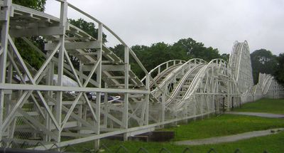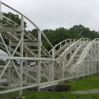 This roller coaster maintains its original wooden track configuration from 1967, featuring an out-and-back layout with a 45-degree maximum vertical angle.