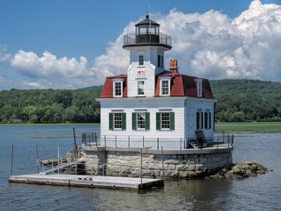 The Esopus Meadows Light stands 17 meters tall on the western bank of the Hudson River, featuring white clapboard exteriors and a red mansard roof.