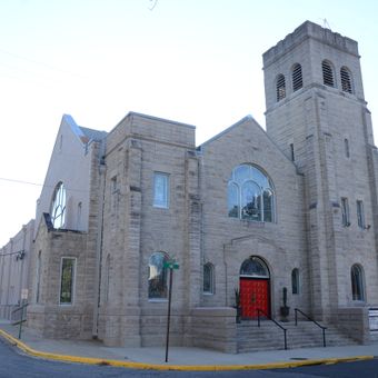 The First Presbyterian Church stands at 123 East Eighth Street, featuring high pointed arches, vertical lines, and intricate stone details throughout its structure.