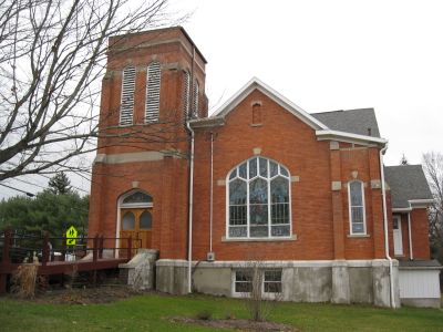 The First Presbyterian Church features Gothic architecture with stone walls, pointed arches, and intricate stained glass windows throughout its structure.