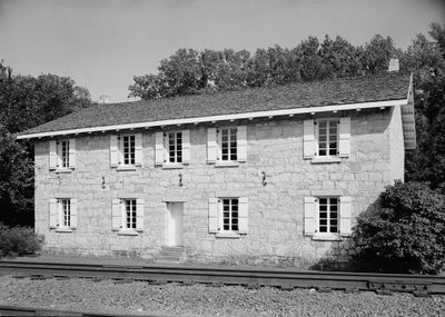 The First Territorial Capitol stands as a two-story stone structure displaying Federal architecture with symmetrical windows and a rectangular layout at Fort Riley.
