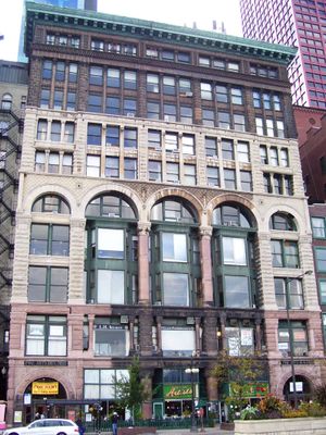 The Fine Arts Building rises ten stories high with granite columns, limestone piers, and oriel windows along Michigan Avenue facing Grant Park.