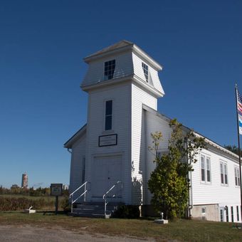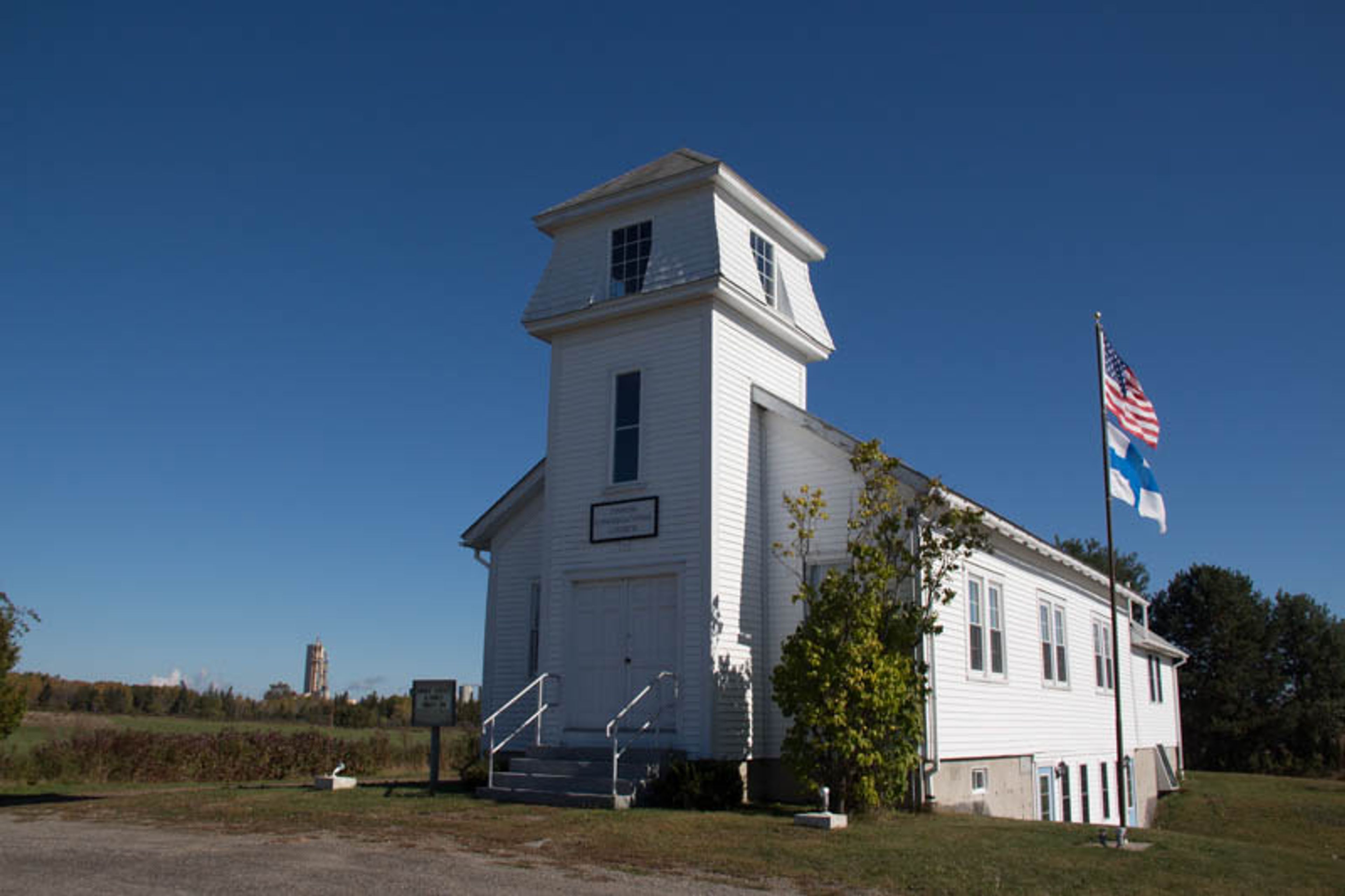 The Finnish Congregational Church features a square tower with a pyramidal roof, double-door entrance, and narrow sash window above the main entrance.