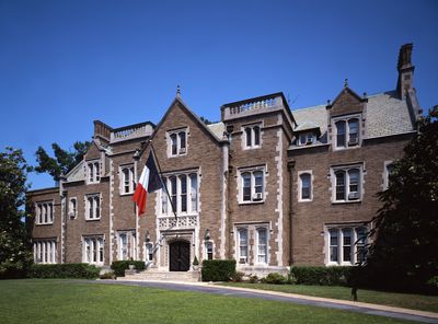 The French ambassador's residence spans 27,000 square feet across multiple levels, featuring prominent gables and flanking towers in Tudor Revival style.