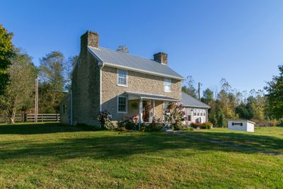 The Fryer House features thick limestone walls, a two-story three-bay design, and one-story frame additions on the east and north sides of the building.