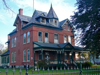 The two-and-a-half-story brick dwelling features sixty-six windows, multiple gables, dormers, and a polygonal turret with a wraparound porch.