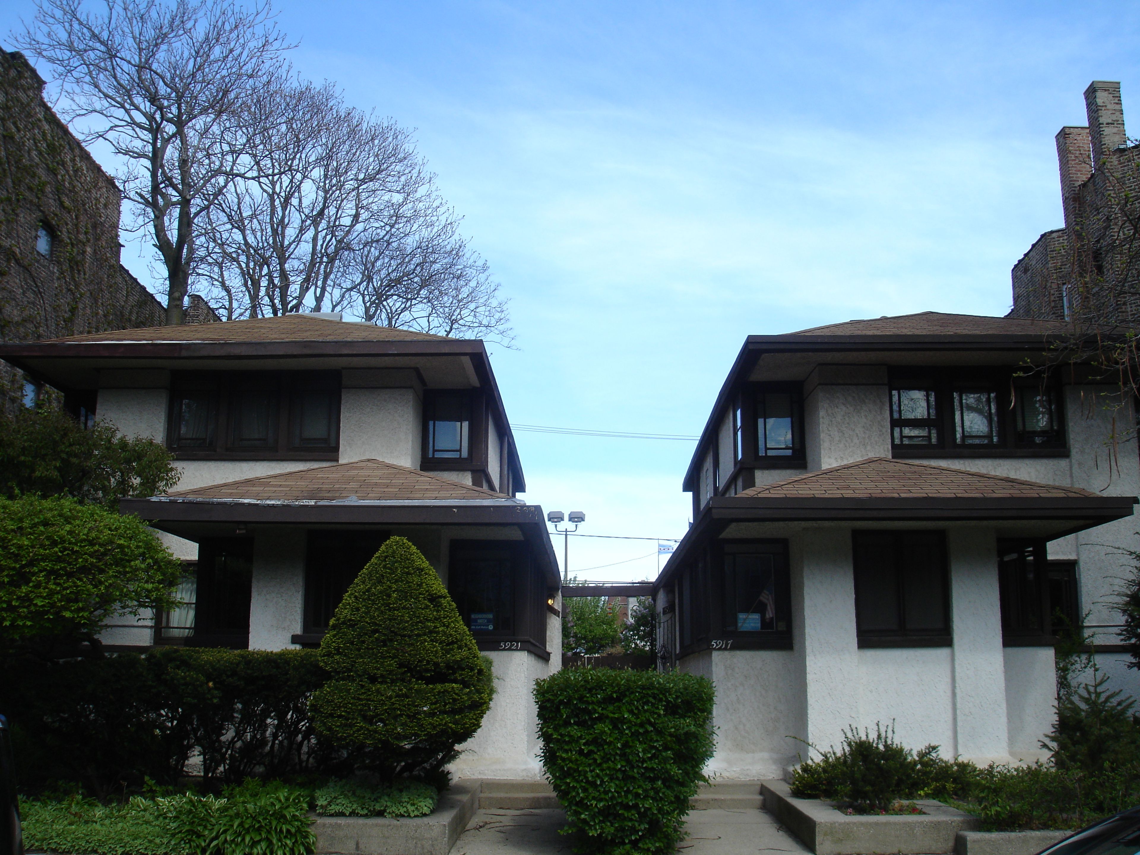 The houses demonstrate how Prairie School principles, with horizontal lines and natural materials, adapted to smaller urban residential settings.