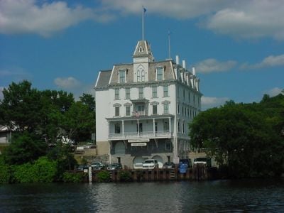The Goodspeed Opera House spans three floors with the main theater located on the upper levels, featuring ornate Victorian architecture overlooking the Connecticut River.