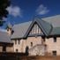 The church features stone walls, Gothic arched windows, stone buttresses, and a slate roof topped with Celtic crosses at the gable peaks.