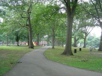 The park contains a natural forest area with trails and small arch bridges crossing Toney's Brook, providing a natural environment within urban surroundings.
